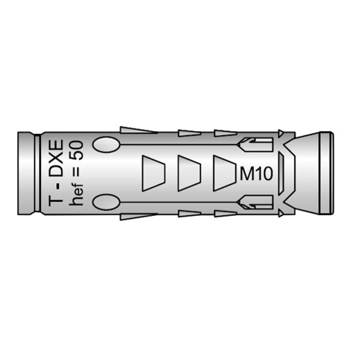 Предназначен для монтажа тяжелых элементов и конструкций в таких материалах, как бетон прочностью от В20 до В50 в нерастянутой зоне, кроме того, пригоден для бетона В12 (с понижением несущей способности), строительного камня плотной текстуры. Удобный в установке анкер с внутренней резьбой. Метрическая внутренняя резьба позволяет использовать стандартные болты или резьбовые шпильки для идеальной адаптации к различным условиям монтажа. \nОтсутствие резьбового крепежного элемента позволяет расширить диапазон применений данного анкера, т.к. толщина прикрепляемого материала не регламентируется.МаркировкаDXE ZN – Анкер-гильза.\n\nОптимизированная геометрия анкера сводит к минимуму усилия при монтаже и позволяет использовать анкер в очень узких пространствах.\n Четырехраспорная гильза равномерно распределяет усилие распора внутри отверстия. \n Метрическая внутренняя резьба позволяет использовать стандартные болты или резьбовые шпильки для идеальной адаптации к различным условиям монтажа.\n Каждый анкер оснащен маркировкой, необходимой при монтаже.ФункционированиеАнкер DXE применяется при предварительном монтажеВо время затяжки конус перемещается в распорную втулку и расширяет её прижимая к стенкам просверленного отверстияДля надёжного сквозного монтажа прикрепляемый конструктивный элемент необходимо зафиксировать на анкере, а шпильку блокировать с помощью контргайки.