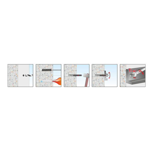 Применяется для монтажа различных изделий и конструкций к основаниям из бетона, камня (плотных пород), такие как обрешетки, консоли, приставные лестницы, кабельные каналы, оборудование, лестничные марши, ворота и фасады.\nСтандартная глубина анкеровки обеспечивает максимальную несущую способность. Это позволяет уменьшить количество точек крепления.\nЗначительно упрощенная установка с минимальной глубиной требует лишь несколько ударов молотка.\nВыступ на торце анкера защищает резьбу от повреждения при забивании и обеспечивает легкий монтаж анкера. Красные полоски на резьбе анкера обозначают стандартную и уменьшенную глубину установки. При уменьшенной глубине установки снижается несущая способность анкера, но увеличивается толщина прикрепляемой детали.\nОцинкованное покрытие обеспечит защиту от коррозии.МаркировкаZJE ZN – Анкер клиновой.\n\nФУНКЦИОНИРОВАНИЕКлиновой анкер ZJE пригоден для предварительного и сквозного монтажа. При определенных условиях пригоден для дистанционного монтажа.Перед монтажом необходимо установить шестигранную гайку в оптимальное положение (болт должен выступать прибл. на 3 мм).Во время затяжки конический болт перемещается в распорную втулку и расширяет её, прижимая к стенкам просверленного отверстия.Глубина установки обозначается нанесенными красными полосками на резьбовой части анкера. Верхняя полоска – стандартная глубина установки, Нижняя полоска – уменьшенная глубина установки.