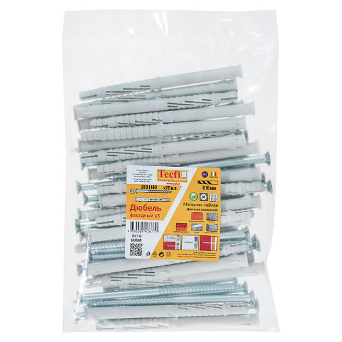Фасадные дюбели предназначены для сквозного монтажа как в полнотелых, так и пустотелых (пористых, щелевых, поризованных) материалах. Благодаря свей конструкции и качественному нейлоновому дюбелю, анкер идеально подходит для крепления в неизвестный или неплотный материал основания. Дюбель оснащен потайной головкой и шлицем TORX, что позволяет устанавливать дюбель с большим моментом затяжки. фасадные дюбели с потайной головкой применяются в тех случаях, когда головка дюбеля может мешать при дальнейшей работе, например монтаж деревянных брусков или досок.\n\nФУНКЦИОНИРОВАНИЕФасадный дюбель Tecfi пригоден для сквозного монтажа.Дюбель в полнотелых материалах работает за счет силы трения, а в пустотелых материалах – за счет внутреннего упора. Дюбель пригоден для установки в пенобетоне/пеноблоках (нагрузка зависит от качества и плотности материала)При установке в пустотелые кирпичи используйте только безударное сверление.В деревянных конструкциях рекомендуется использовать шурупы с потайной головкой; для металлических конструкций предназначены дюбеля с бортиком и пресс-шайбой на шурупе, в головке которого предусмотрен шлиц под биту.Фасадный дюбель устанавливается гайковертом или мощным шуруповертом с соответствующей насадкой (TORX или шестигранной) в заранее просверленное отверстие.