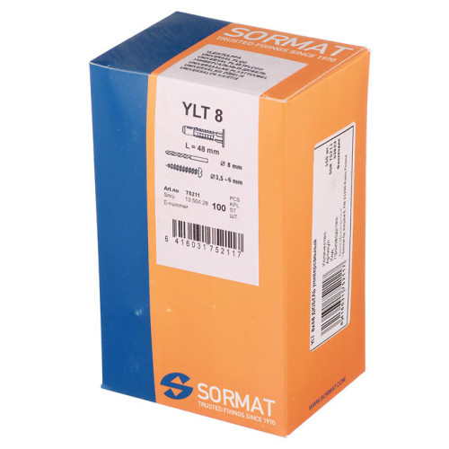 Предназначен для легких креплений (небольшие нагрузки) в бетон, полнотелый кирпич, пустотелый кирпич, а также в листовые материалы. Распорная часть дюбеля позволяет ему работать в полнотелых материалах как обычный дюбель, а в пустотелых материалах и листовых материалах сворачивается в узел при затягивании шурупа. В дюбель рекомендуется устанавливать универсальный саморез, т.к. угол, шаг и заточка резьбы такого самореза производит правильное раскрытие дюбеля в отверстии, что позволяет выдерживать большие нагрузки в отличие от черных саморезов (ГД). Дюбель выполнен из полиэтилена.\nМинимальный диаметр самореза для дюбеля YLT 8 – 3,5 мм, максимальный – 6 мм.\nДлина самореза = длина дюбеля + толщина прикрепляемого материала. Размерыдиаметр 8 мм, длина 48 мм.МаркировкаYLT (Универсальный пластиковый дюбель).\n\nОсобенностиСпециальная форма выступов, расположенные за фланцем дюбеля, удерживают дюбель в отверстии при монтаже, и препятствуют прокручиванию дюбеля в отверстии.Способ монтажаПросверлите отверстие буром или сверлом по бетону. Вставьте дюбель в отверстие, установите прикрепляемый материал или деталь и закрутите универсальный саморез. В момент закручивания самореза дюбель расширяется в отверстии при установке в плотный материал, а при монтаже в листовой материал, закручивается в узел.
