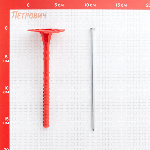 Предназначен для крепления теплоизоляционных изделий толщиной к внутренним и наружным поверхностям зданий, различного назначения, в том числе в системах вентилируемых фасадов и колодезной кладке, в такие основания, как тяжелый и легкий бетон, полнотелый керамический и силикатный кирпич, керамзитобетонный блок. За счет широкой шляпки дюбель часто называют "парашют" или тарельчатый дюбель. Конструкция широкой шляпки дюбеля плотно прижимает теплоизоляцию, отверстия позволяют утопить дюбель в клее без потери эластичности шляпки. В комплекте с дюбелем поставляется металлический оцинкованный гвоздь.\n\nПластмассовые стержни изготовлены из полиамида, модифицированного стекловолокном с высокой ударной вязкостью, или полипропилена. металлические стержни – стальные, с гальваническим цинковым покрытием, в ряде случаев – с характерным черепичным витком резьбы. \nПрименяются для механического крепления тяжелых теплоизоляционных плит из минеральной ваты и легких материалов типа пенополистирола к бетонным основаниям (бетон, кирпич, камень), пустотелым материалам (пустотелый блок, дырчатый кирпич).\nМонтаж соединителя производится механическим вбиванием стержня. Конструкция "тарелки" дюбеля позволяет легкое покрытие слоем штукатурки. Благодаря использованию материалов, стойких к атмосферным условиям, не возникает термических мостиков, что обеспечивает долгую сохранность фасада.