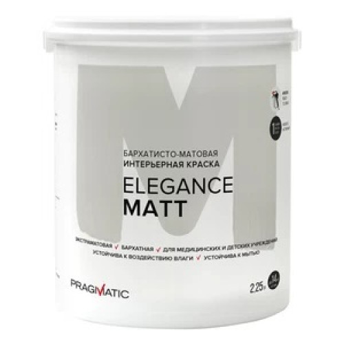 Elegance Matt краска матовая интерьерная. Тиксотропная водно-дисперсионная краска. Образует матовое покрытие, стойкое к воздействию нейтральных моющих средств, водному раствору Хлорамина Б с концентрацией до 3 % и мокрому трению (1 класс по DIN EN 13300). Выпускается в двух базах – А и С.