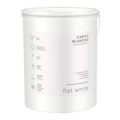 Глубокоматовая интерьерная краска Carte Blanche Flat White. Образует глубокоматовое покрытие, стойкое к воздействию моющих и дезинфицирующих (3 %-ному раствору Хлорамина Б) средств, и обладающее высокой стойкостью к влажному истиранию (класс 1 по DIN EN 13300); выпускается в двух базах – А и С. Применяется для окраски потолков помещений, потолочных плинтусов и лепнины из полиуретана и гипса (молдингов, потолочных розеток, колонн, пилястров, пьедесталов, консолей, ниш и других декоративных изделий и декоративных элементов) в зданиях и сооружениях всех типов ― А, Б, В, включая дошкольные образовательные, образовательные и медицинские организации. Краску наносят на железобетонные плиты перекрытий, подвесные потолки с гипсокартонными или гипсоволокнистыми листами, на гипсовые 3D панели. Качество потолочной поверхности бетонных плит, гипсокартонных и гипсоволокнистых листов должно быть не ниже категории К3 по СП 71.13330.2017. Потолочные плинтусы и лепнина из полиуретана должны быть предназначены под окраску водно-дисперсионными красками.