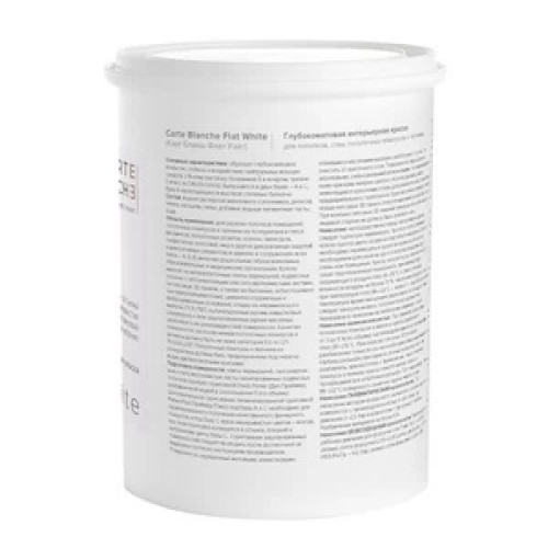 Глубокоматовая интерьерная краска Carte Blanche Flat White. Образует глубокоматовое покрытие, стойкое к воздействию моющих и дезинфицирующих (3 %-ному раствору Хлорамина Б) средств, и обладающее высокой стойкостью к влажному истиранию (класс 1 по DIN EN 13300); выпускается в двух базах – А и С.