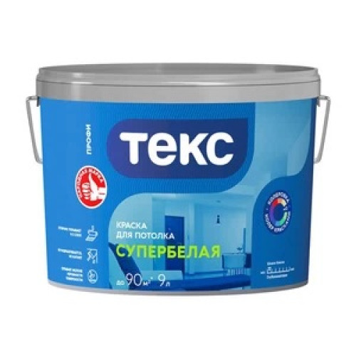 Водная краска повышенной белизны, удобной для нанесения консистенцией и экономичностью в расходе. Краска образует матовое паропроницаемое («дышащее») покрытие. Предназначена для высококачественной окраски потолков и верхних панелей стен внутри сухих помещений по бетонным, оштукатуренным, гипсокартонным, кирпичным, деревянным поверхностям. Для придания необходимого оттенка рекомендуется использовать колеровочные краски «ТЕКС».