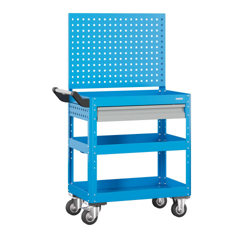 Размер 800х700х450мм. С перфорированной панелью для навесных элементов и выдвижным ящиком на шариковых телескопических направляющих. Общая равномерно-распределённая нагрузка на тележку - до 100кг. Корпус выполнен из листовой стали толщиной от 0,6 до 1,5мм., покрыт полимерной порошковой краской. Верхняя и средняя полка имеют высоту борта 40мм., нижняя полка имеет высоту борта 60мм
