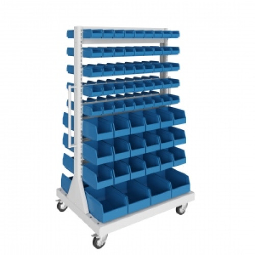Система специальных держателей обеспечивает размещение пластиковых контейнеров в 9 ярусов с обеих сторон мобильной стойки.