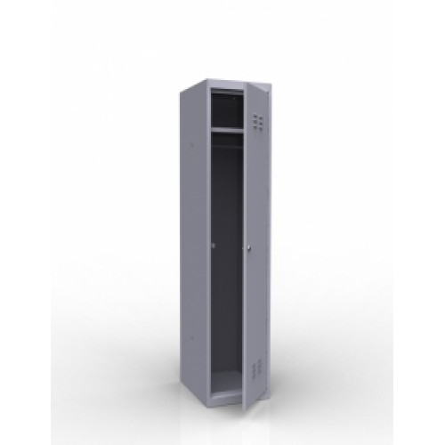 Односекционный металлический шкаф для одежды имеет полную внутреннюю компелацию: полку для головных уборов, пластиковые перекладины для вешалок и два крючка для одежды. проушина для навесных замков. Размер секций обеспечивает комфортное размещение верхней одежды, в том числе зимней. Конструкция предусматривает возможность установки дополнительной полки для обуви.
