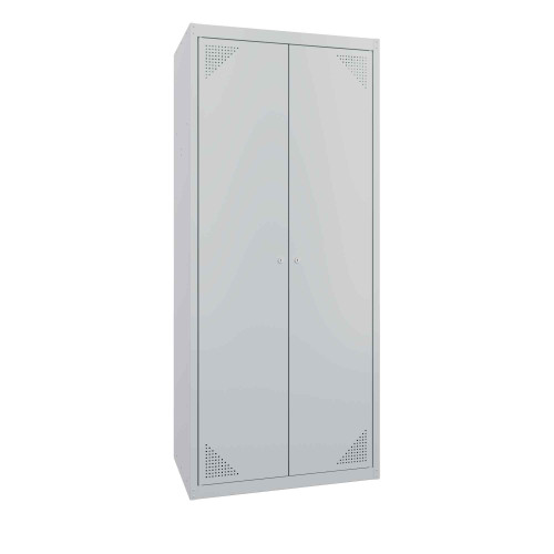 Двухсекционный металлический шкаф для одежды имеет полную внутреннюю комплектацию: полки для головных уборов, пластиковые перекладины для вешалок и четыре крючка для одежды. Размер секций обеспечивает комфортное размещение верхней одежды, в том числе зимней. Конструкция предусматривает возможность установки дополнительной полки для обуви.