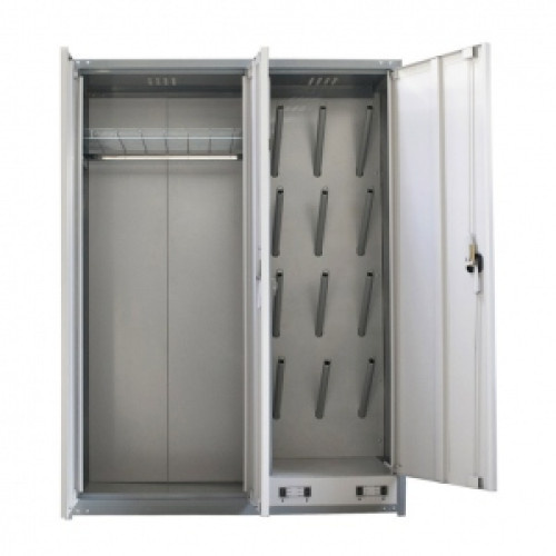 Шкаф представляет собой металлический корпус, имеющий рамную конструкцию. Корпус разделен по ширине на отделение для сушки одежды с двумя дверьми, закрывающимися ригельным замком, и отделение для сушки обуви также закрывающееся ригельным замком. В нижней части отделения для обуви встроен блок нагрева, нагнетающий теплый воздух как в отделение для одежды, так и в отделение для обуви.