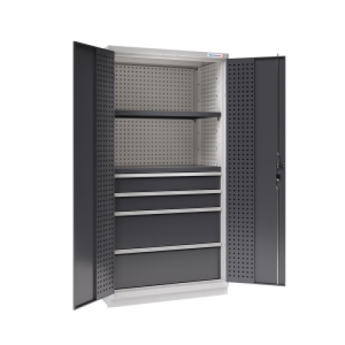 Шкаф инструментальный Fabrik тяжёлой серии представляет собой сборно-разборную конструкцию, предназначен для хранения оснастки, приспособлений и инструмента в мастерских, цехах и других производственных зонах. Шкаф изготовлен из листовой стали и обеспечивает надежное запирание дверей ригельной системой.