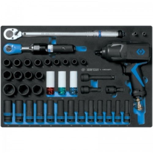 Входящие в комплектацию набора инструменты предназначены для работы пневматическим гайковертом. Динамометрический ключ поможет контролировать усилие затяжки крепежных соединений согласно установленным в техническом паспорте параметрам.Входящий в материал инструментов хром-молибденовый сплав придаёт особую прочность и стойкость к ударным нагрузкам.