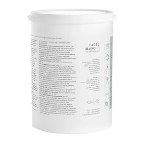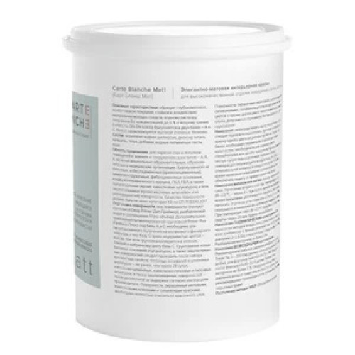 Краска элегантно-матовая интерьерная Carte Blanche Matt база. Образует глубокоматовое покрытие, стойкое к воздействию моющих и дезинфицирующих (5 %-ному раствору Хлорамина Б) средств, и обладающее высокой стойкостью к влажному истиранию (класс 1 по DIN EN 13300). База А характеризуется высокой степенью белизны.