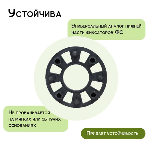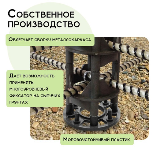 Фиксатор арматуры Подставка используется в монолитном строительстве при отливке фундаментов зданий. Совместим с фиксатором арматуры "Многоуровневый" и делает возможным его установку на гравийных, песчаных, земляных и иных мягких или сыпучих грунтах.