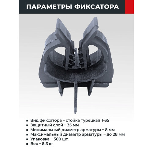 Фиксатор арматуры стойка турецкая Т-35 предотвращает проявление арматурного каркаса на поверхности бетона. Т-35 - тип фиксатора для заливки горизонтальных плоскостей. Принцип действия максимально прост - изделие одевается на арматуру и фиксируется прочной клипсой-зажимом. Подходит для гладких и рифленых стержней от 8 до 28 мм в диаметре. Фиксатор изготавливается из полимера и устойчив к резким перепадам температур. Может использоваться со стальной и композитной арматурой. При установке на мягкие, сыпучие грунты и изоляционные материалы рекомендуется дополнительно использовать фиксатор "Подставка".