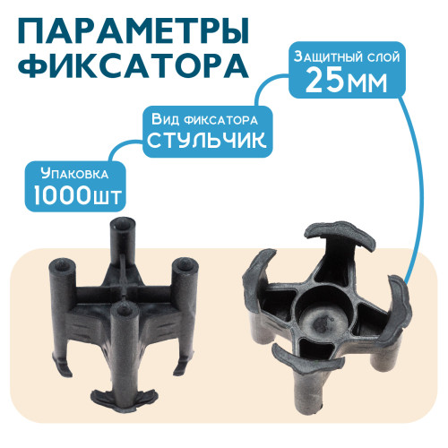 Фиксатор арматуры Стульчик 25 предназначен для соблюдения нормативного защитного слоя между арматурной сеткой и опалубкой. Совместим с металлической и композитной арматурой диаметром от 4 до 16 мм. Изготавливается из полимера (полиэтилен и полипропилен), что значительно повышает его прочность. При этом специальные добавки позволяют эксплуатировать изделие даже в зимний период. Горизонтальный тип фиксатора. При установке на мягкий или сыпучий грунт и изоляционные материалы необходимо использовать подставку под фиксатор. "Стульчик" - идеальное решение для заливки перекрытий, бетонных фундаментов, полов.