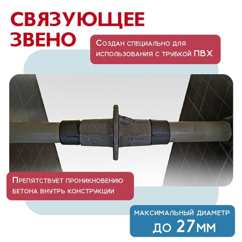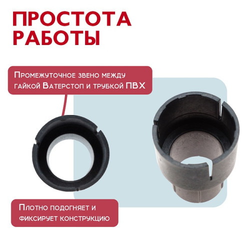 Фиксатор для гайки Ватерстоп - промежуточное звено между гайкой Ватерстоп и трубкой ПВХ. Устанавливается с одной стороны на гайку Ватерстоп, с другой стороны на трубку ПВХ, тем самым, обеспечивая полную герметичность и исключая попадание бетонной смеси на стяжной винт. После распалубки конструкция остается в теле бетона. Фиксатор изготовлен из прочного морозостойкого пластика, благодаря чему может использоваться при проведении монолитных работ даже в зимнее время года.