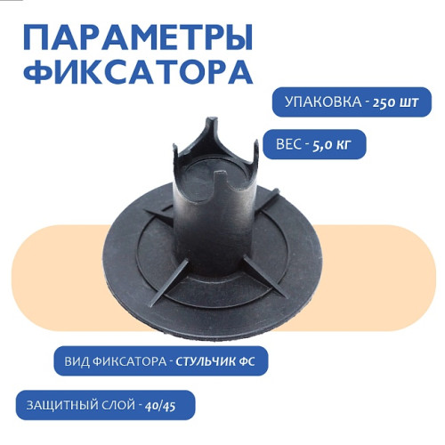 Фиксатор арматуры ФС 40 применяется в строительстве при заливке фундаментов, межэтажных перекрытий, полов и тротуаров. Создает защитный слой 40, 45 мм между арматурой и опалубкой, препятствует проявлению арматурной сетки на поверхности бетона. Максимальная нагрузка 150-200 кг.
