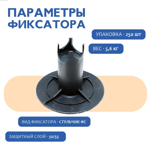 Фиксатор арматуры ФС 50 применяется в строительстве при заливке фундаментов, межэтажных перекрытий, полов и тротуаров. Создает защитный слой 50, 55 мм между арматурой и опалубкой, препятствует проявлению арматурной сетки на поверхности бетона. Максимальная нагрузка 150-200 кг.