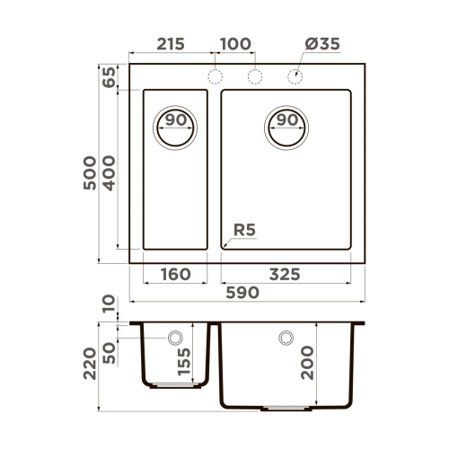 ширина 590 ммxдлина 500 ммxглубина 200 мм