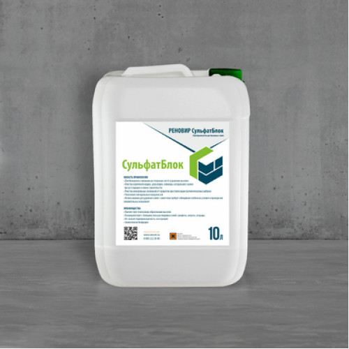 РЕНОВИР СульфатБлок – это водный раствор комплексообразователя, который в сочетании с отсечной противокапиллярной гидроизоляцией РЕНОВИР Микросил и очистителем поверхностей РЕНОВИР Антисоль и ФасадКлинер используется при санации зданий. При обработке пористых минеральных оснований состав проникает в основу, взаимодействует с солями и преобразует их в малорастворимые соединения, тем самым препятствуя их дальнейшей миграции.
