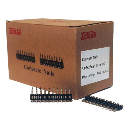 Кованый гвоздь Toua CN Bullet Point по бетону металлу и кирпичу. \nИз названия данных гвоздей (Bullet Point – Пулевидное острие) понятно, что острие этих гвоздей имеет пулевидную форму, т.е. не прямолинейное конусное утолщение от острия к основному диаметру, а плавное утолщение по изогнутой кривой. Данная форма острия достигается не путем штамповки – отсечения лишнего материала с наконечника гвоздя, а прокатыванием этого наконечника в сдавливающих роликах. Данный процесс позволяет не только добиться более правильной (баллистической) и плавной формы острия, но также и большего уплотнения материала гвоздя в зоне его острия. Именно из-за этого уплотнения данные гвозди называют кованными. \nКованые гвозди Bullet Point также имеют редуцированную форму тела для более успешного вхождения в материалы повышенной плотности и улучшенное гальваническое покрытие, защищающее от коррозии, что делает их более пригодными для монтажа вне помещений и в условиях влажной агрессивной среды (например, в прибрежных регионах). \nТакие гвозди рекомендуются для монтажа к бетону средней и высокой прочности, к потолочному бетону и как к немассивному (до 5 мм), так и к массивному металлу (более 5 мм).\n\n